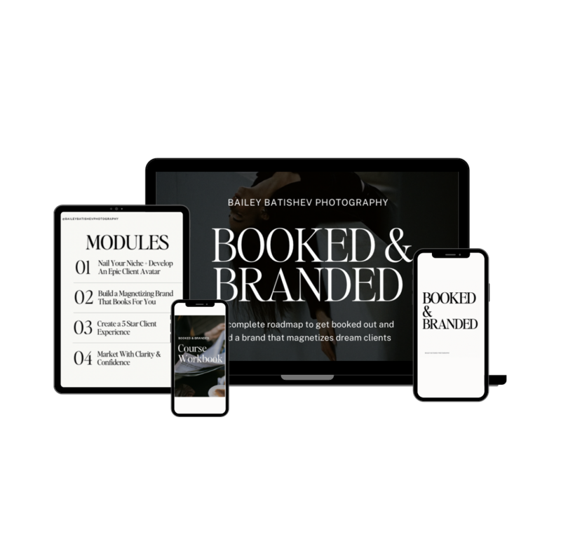 Booked & Branded is your step-by-step course + toolkit to finally build a brand that finally books your exact dream clients. Inside, you’ll nail your niche, craft a brand that magnetizes, develop a client experience they can’t stop talking about, and learn how to market like the confident CEO you are. No fluff. No burnout. Just aligned bookings, rave-worthy experiences, and a photography business that looks—and sells—as elevated as your work.